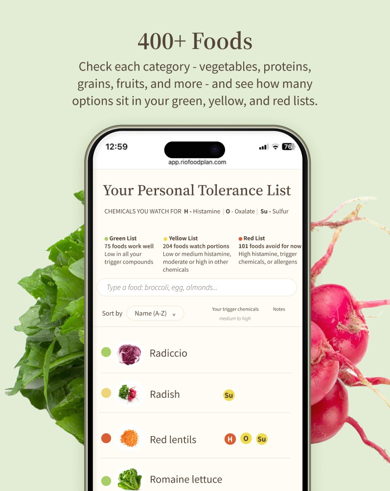 Know what foods work for your body: spot hidden triggers, find your go-to low-histamine options, and feel good about what's on your plate.